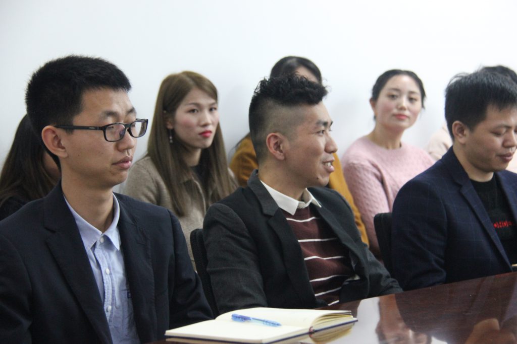 公司全體員工在會議上認真傾聽領導和其他同事發言