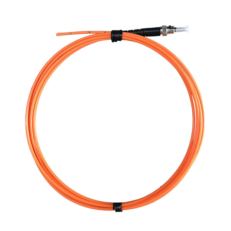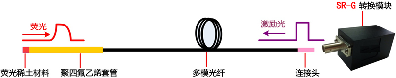光纖探頭由ST接頭、光纖光纜、末端感溫端三部分組成。ST接頭是與光電模塊的連接部分;光纖光纜為傳光部分,內部為石英光纖,石英光纖外部有涂覆層和包層,最外部為特氟龍保護套;末端感溫端含有感溫稀土材料,用于產生含有溫度信息的光信號;光纖整體耐200℃高溫,外表直徑為3mm。長期彎曲半徑13.2cm。短期彎曲半徑4.4cm。光纖引出線對地距離為0.4m的情況下,耐受工頻電壓100KV,持續時間5min。